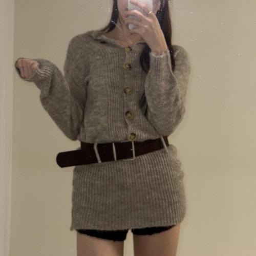 [오조크][오조크(OZOC)] 퍼프 숄더 버튼 디테일 플레어 니트 원피스 (택가격 138000원)