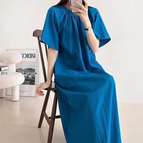 [다잇템]여자 볼드숄더 리본넥 파랑 더블포켓 롱원피스 (33260976A)