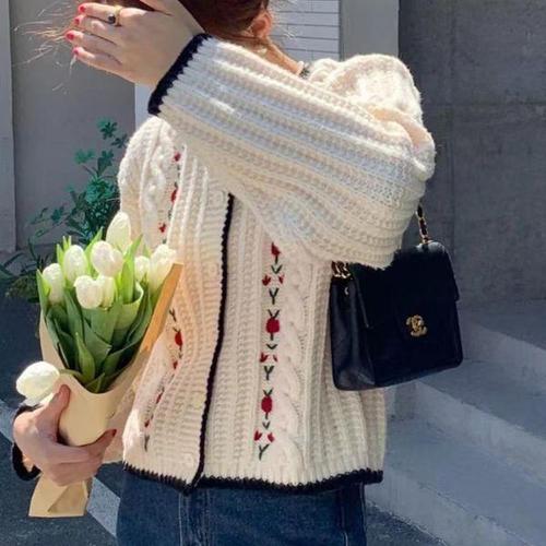 [옷자락]여성 러블리 꽃자수 꽈배기 배색 루즈핏 숏 가디건