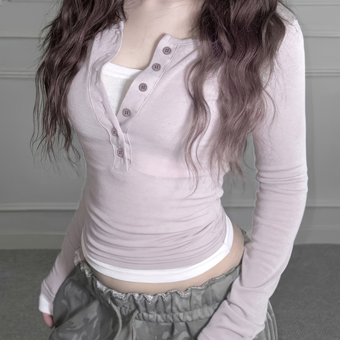 TEMU 여성 Y2K 컬러 블록 버튼업 크롭 탑 - 긴소매, V넥, 라이트 핑크 & 화이트, 캐주얼 가을/겨울 웨어, 혼방, 세탁기 사용 가능, 캐주얼 웨어 탑|V넥 탑| 혼방