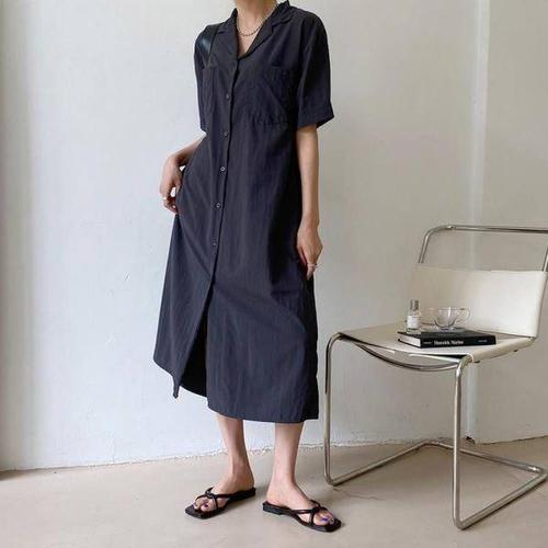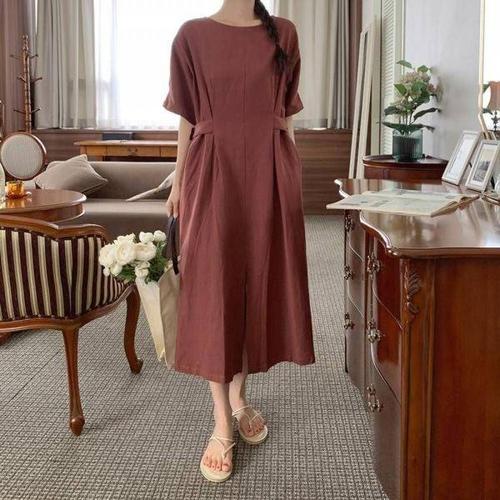 [에이비에프지]라운드넥 솔리드 쉬폰 롱 반팔 원피스 APZ3HO06H