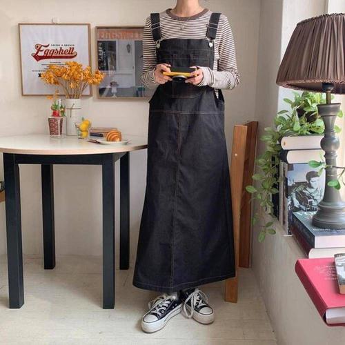 밴딩 뷔스티에 원피스 멜빵 포켓 쉬폰 흑청 셔