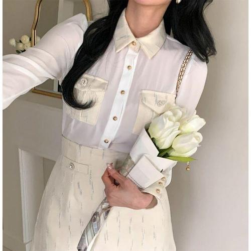 [신상오픈런]여성 하객 패션 콩 단추 투포켓 배색 카라넥 쉬폰 셔츠