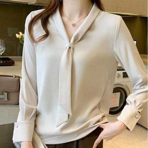 [에이치플러스몰]무지 카라넥 쉬폰 리본 셔츠 하객 온나핏 데님