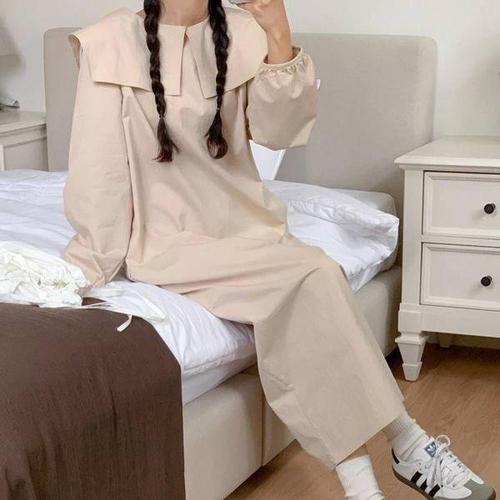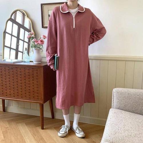 ORZQU 봄가을 여성 캐주얼 시크 칼라넥 배색 페이크 투피스 긴팔 원피스 플레어 스커트
