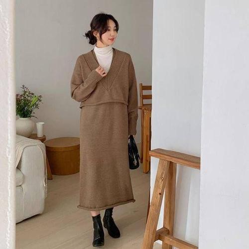 [에이치플러스몰]쉬폰 셔츠 롱니트 트위드 라운드넥 미니 원피스
