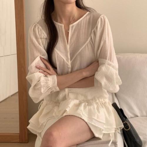 |CCH431E|여성 캉캉 퍼프 시스루 쉬폰 긴팔 티셔츠