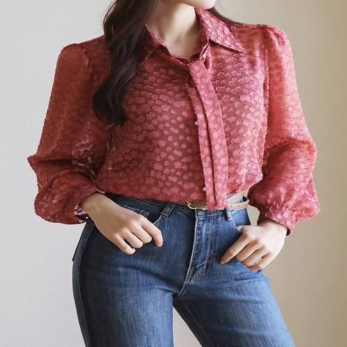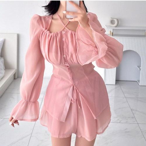 [옷자락]여성 쉬폰 시스루 셔링 블라우스와 반바지 세트