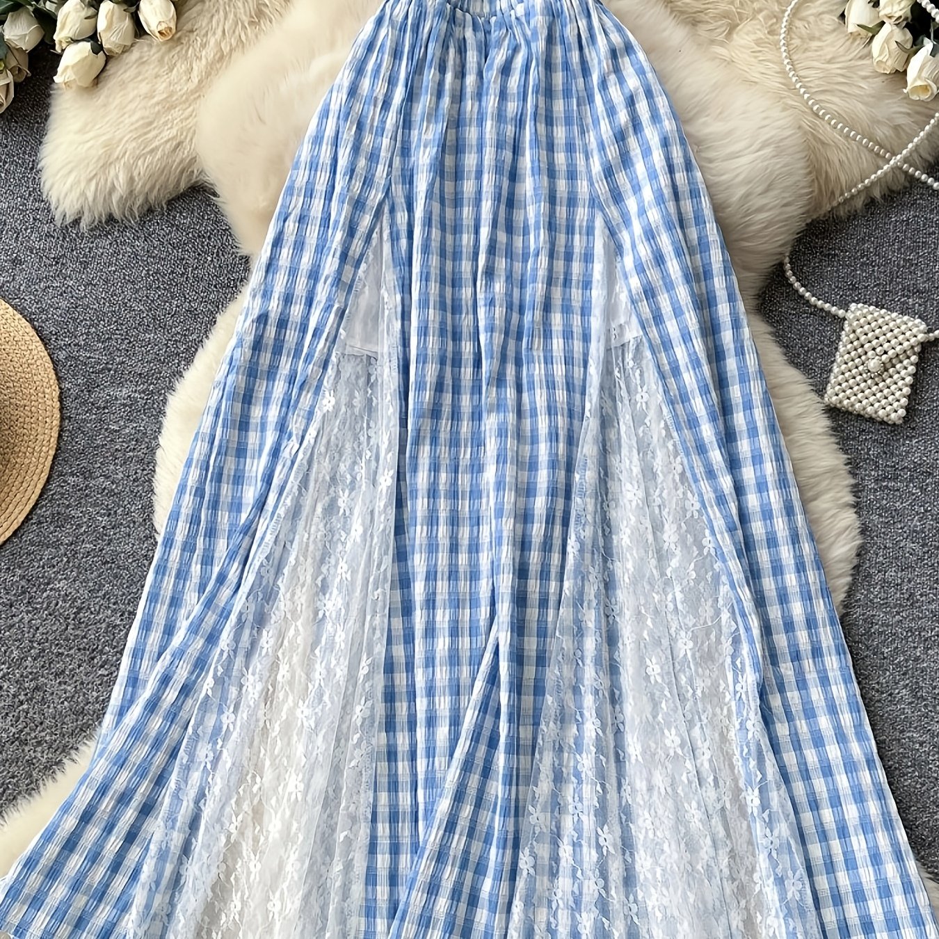 TEMU 새로운 봄/여름 여성용 A라인 스커트. 달콤한 블루 & 화이트 체크 패턴과 레이스 장식이 특징이며, 캐주얼한 외출 또는 휴가에 완벽하게 어울립니다.