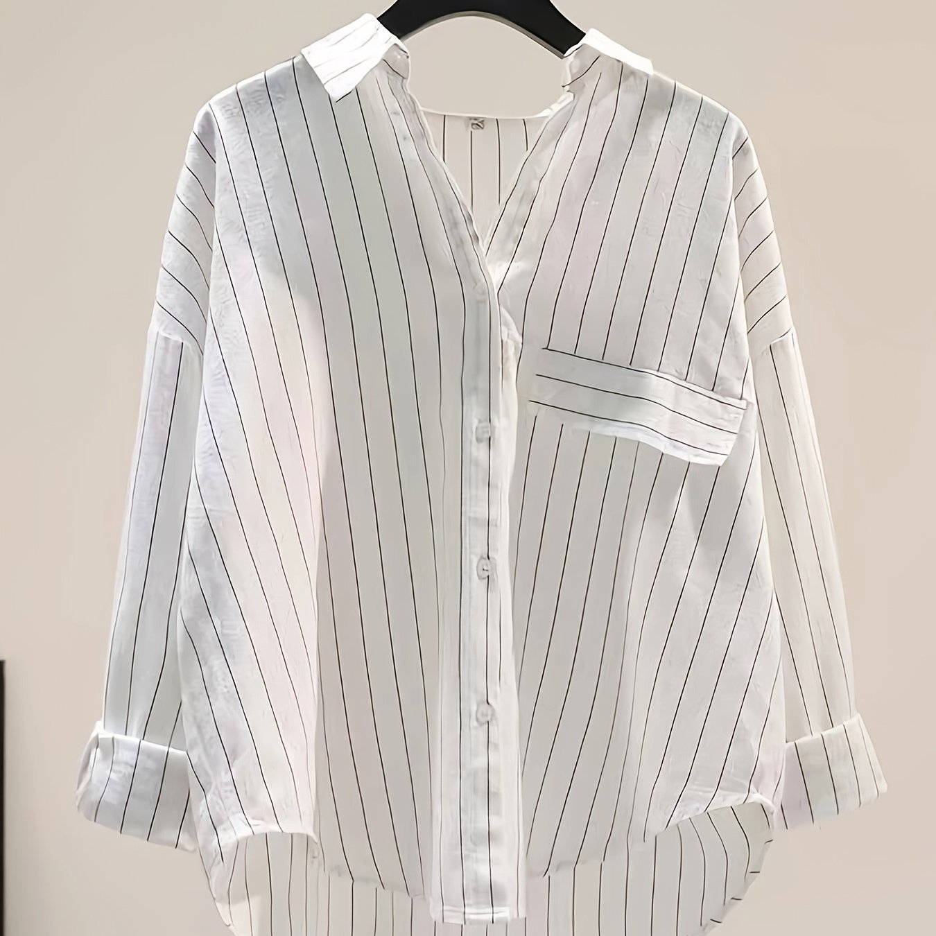 TEMU 봄, 여름에 잘 어울리는 단색 캐주얼 스타일 여성 셔츠입니다. 흰색 원단, 칼라, 긴소매, 불규칙한 밑단이 특징입니다. 이 넉넉한 배트윙 셔츠는 출퇴근, 홈웨어에 완벽하며 빈티지 엘레강스한 감각을 연출합니다.
