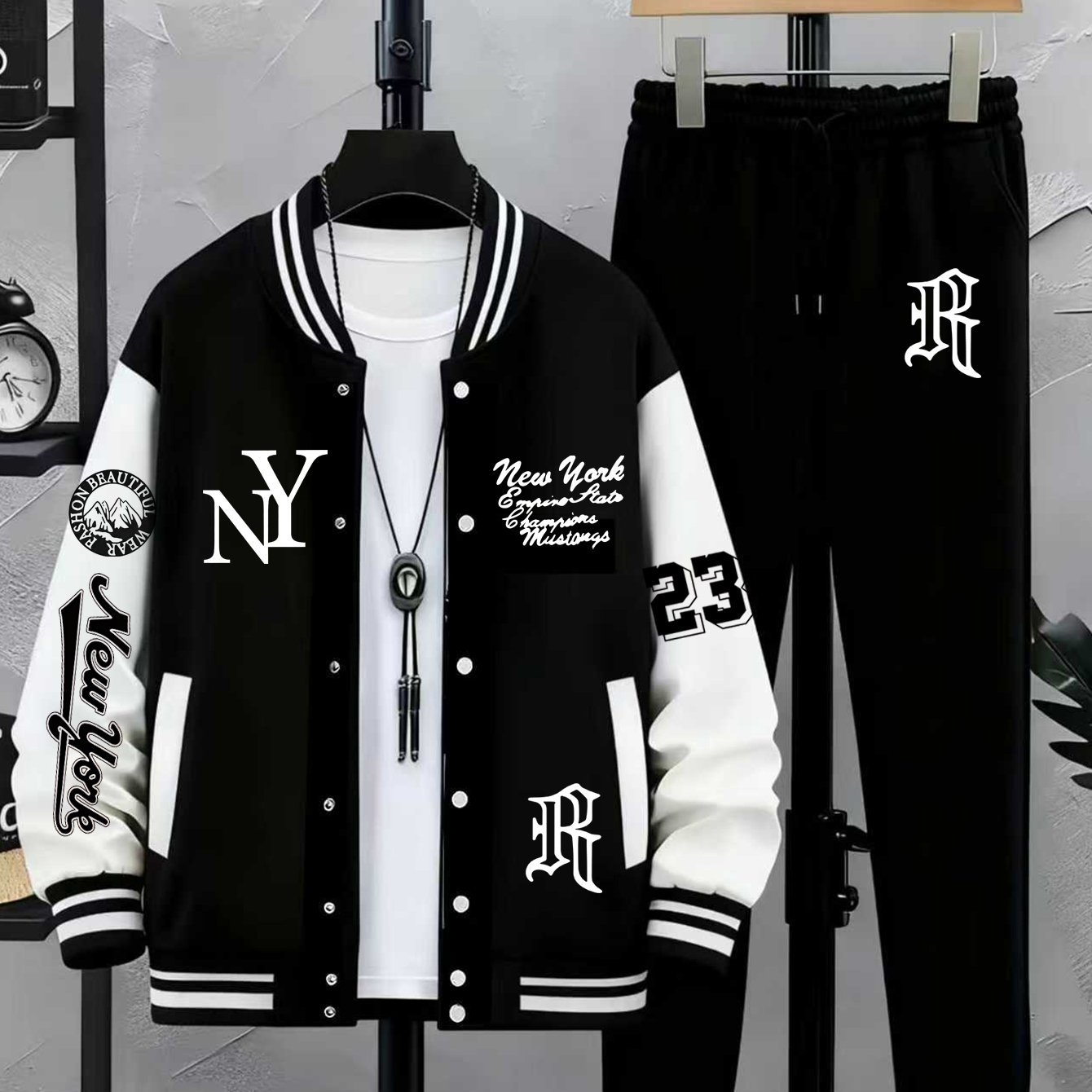 TEMU 겨울 따뜻한 재킷 및 바지 세트 | 뉴욕 테마 프린트, 야구 칼라 캐주얼 스타일, 기하학적 패턴, 남성용으로 완벽