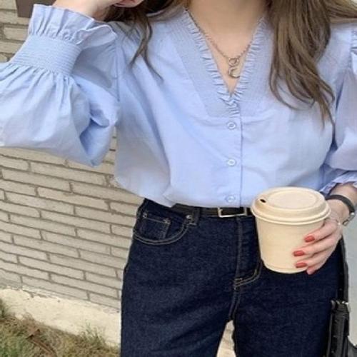 [엄지척]스모크밴딩 브이넥 데일리 셔츠 블라우스 어깨셔링_19642774_667501