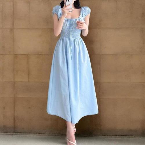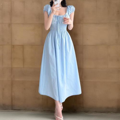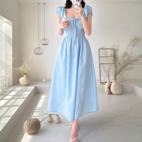[신상오픈런]여성 스모크 밴딩 스퀘어넥 플레어 반팔 롱 드레스