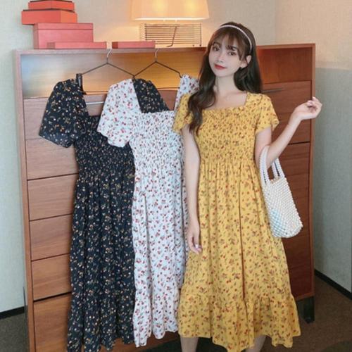 여자 플라워 패턴 스모크 스퀘어넥 원피스 URK-489