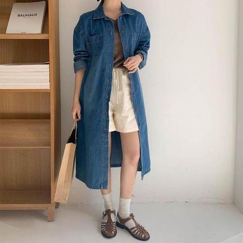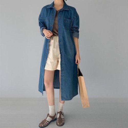 [신상오픈런]여성용 캐주얼 카라넥 롱 데님 원피스 더블 포켓 스타일
