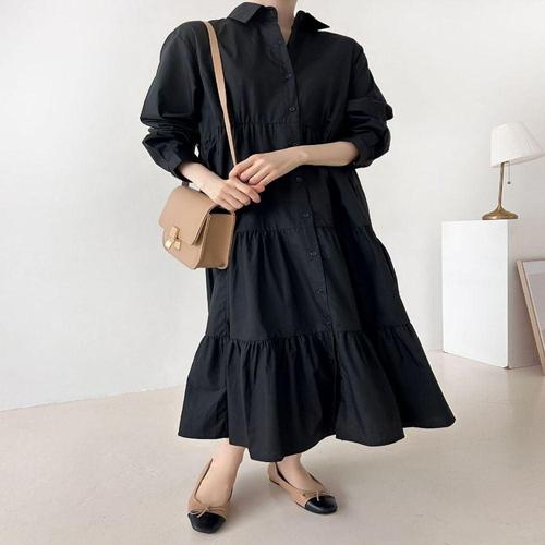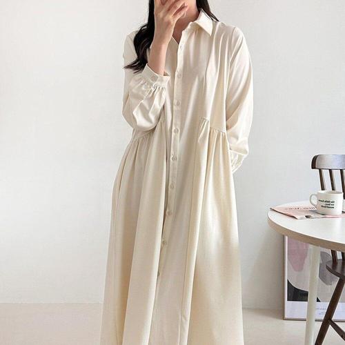 여성 3컬러 카라넥 단추 긴팔 클단정한 롱원피스 WFK5KXZ