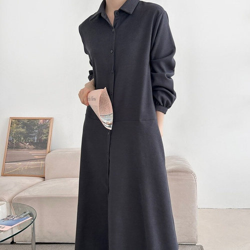 플러리싱 / 심플 무지 루즈핏 플레어 카라넥 롱 원피스 플러리싱