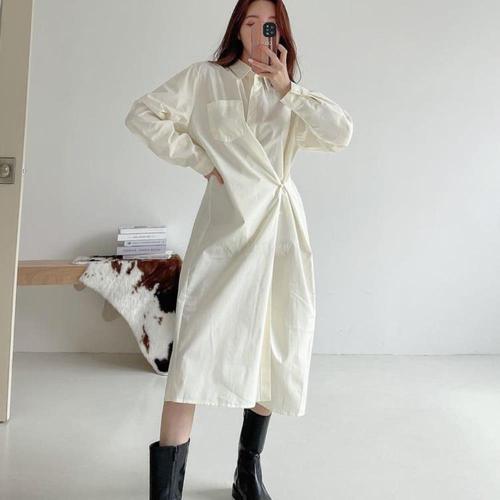 [옷자락] [시즌오프]카라넥 긴팔 남방 무지 랩 롱 원피스_5