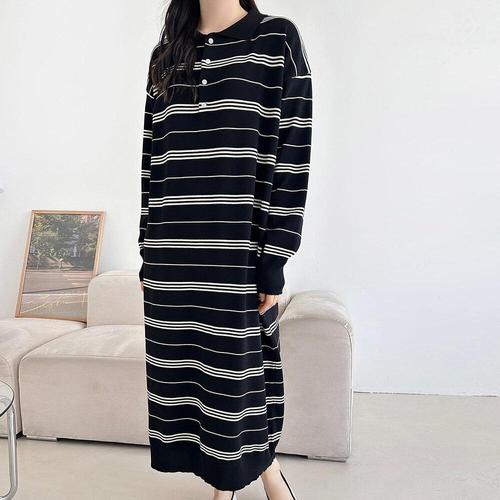 [다잇템][다잇템] 여자 스프라이프 부드러운 스웨터 단추 카라넥 롱원피스_24422443_588872
