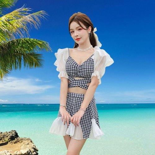 쉬폰 퍼프 소매 스트링 미들 투피스 수영복 모노키니 치마세트 WFKNQ1Y