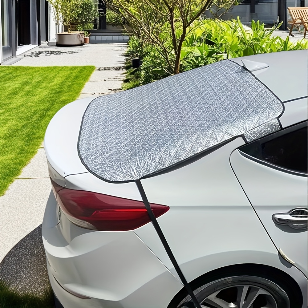TEMU 자동차 뒷유리용 스노우 커버, 4개의 자석과 2개의 후크가 특징이며 반사 선바이저 역할도 함.