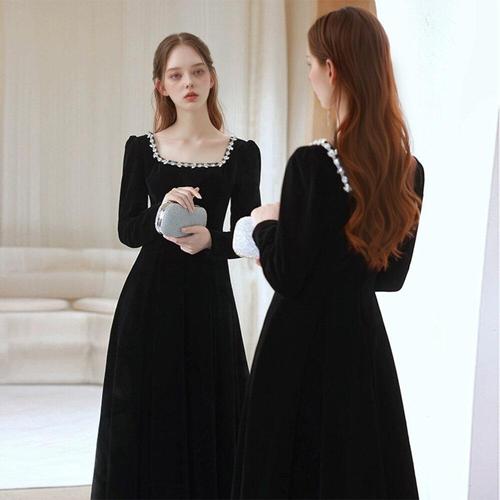 [교복몰]블랙벨벳 스퀘어넥 실버 플라워라인 퍼프숄더 드레스