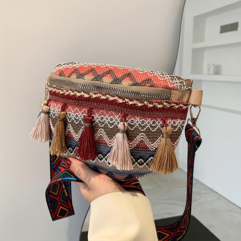 TEMU 1개 여성용 에스닉 태슬 웨이브 벨트 백 - 기하학적 크로스바디 허리백, 카키 지퍼 클로저 & 폴리에스터 안감, 여행/쇼핑/일상 사용, 캐주얼 아웃팅, 태슬 디테일, 내구성 있는 소재, 패션 러버즈를 위한 허리 가방