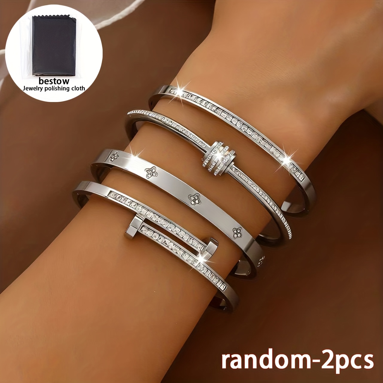 TEMU 스테인리스 스틸 팔찌 2개 세트 [+청소용 천 1개] - 여성용으로 아름답게 디자인된 우아한 팔찌, 저녁 식사 행사, 모임 및 다양한 행사에 적합