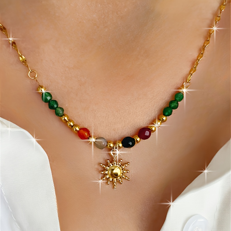 TEMU 316L 스테인리스 스틸 선 펜던트 목걸이 - 터키석, 카넬리언 & 레드 비즈, 골든톤 체인, 남녀공용 보홀릭 멀티레이어 비즈 디자인, 캐주얼/포멀 액세서리, 내구성 있는 비즈 구조