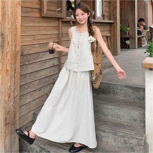 [에이치플러스몰]여자 여름 편한 스트라이프 민소매 나시 블라우스 롱스커트 세트