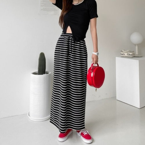 (당일출고) 배색 단가라 H라인 플레어 스트라이프 스트링 밴딩 로우라이즈 맥시 롱 스커트 2color