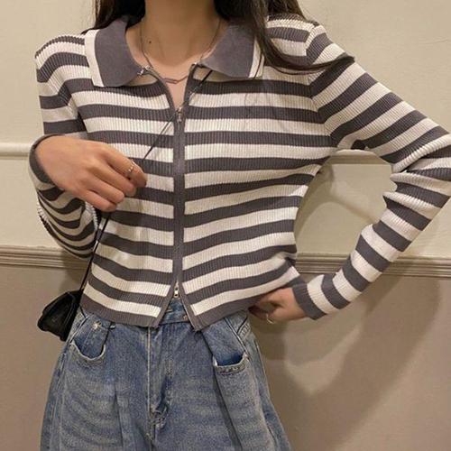 [옷자락]여자 단가라니트 반집업 배색 줄무늬 가을겨울 카라티