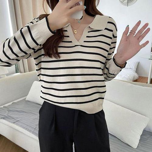 [에이치플러스몰]스트라이프 카라 긴팔 니트 티셔츠 단가라 브이넥