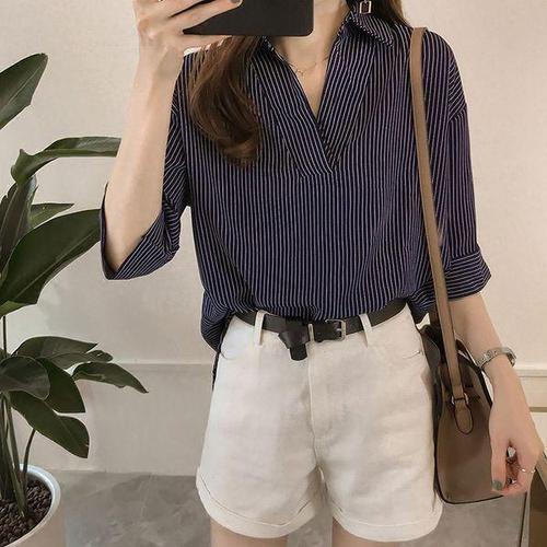 [에이치플러스몰]여성 스트라이프 오픈 블라우스 카라 2컬러 티셔츠