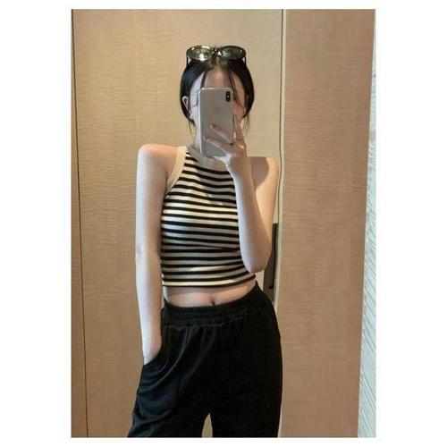[셀러허브_여성트랜드패션]ONM 여성 티셔츠 홀터넥 스트라이프 크롭탑민소매티