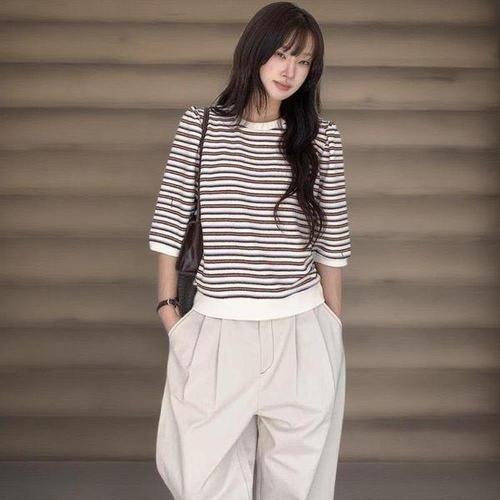 [신상오픈런]여성 배색 스트라이프 7부소매 라운드넥 티셔츠