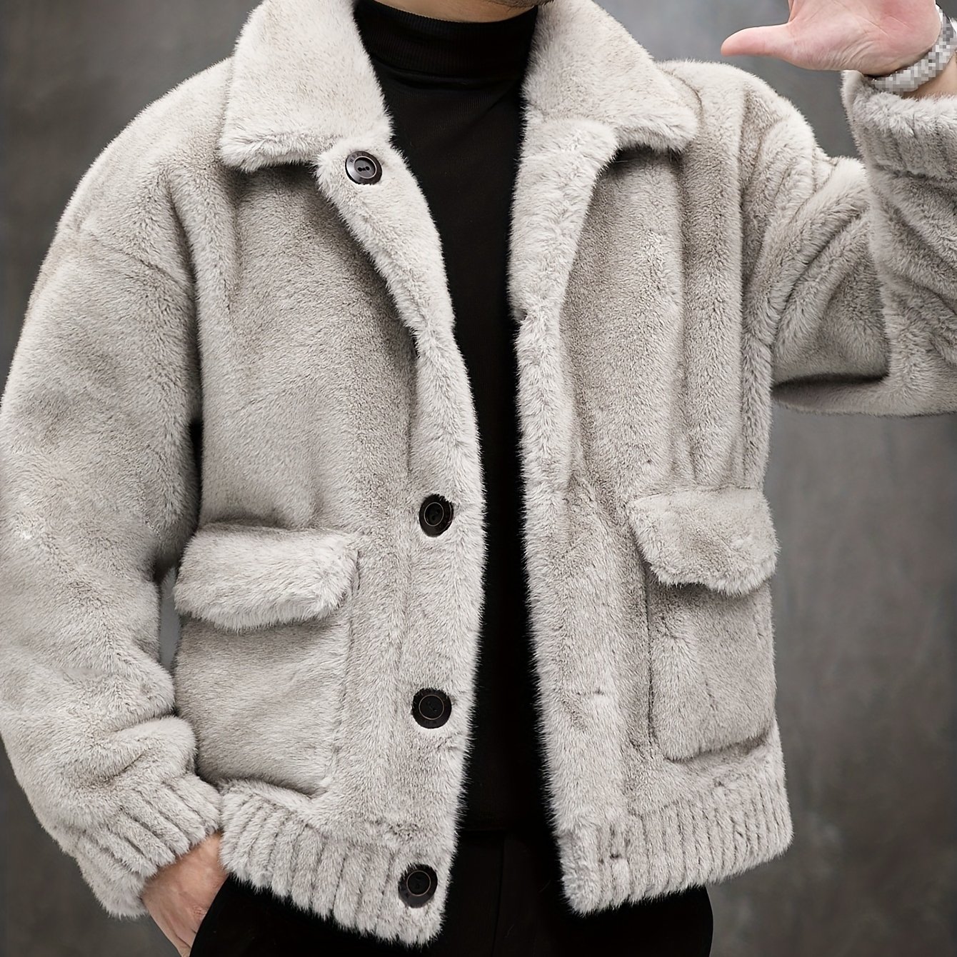TEMU 남성용 스타일리시 인조 퍼 재킷 - 따뜻하고 포근한 연회색 겨울 코트, 단추 소매, 긴 소매, 캐주얼 아웃도어용 앞주머니, 겨울 재킷
