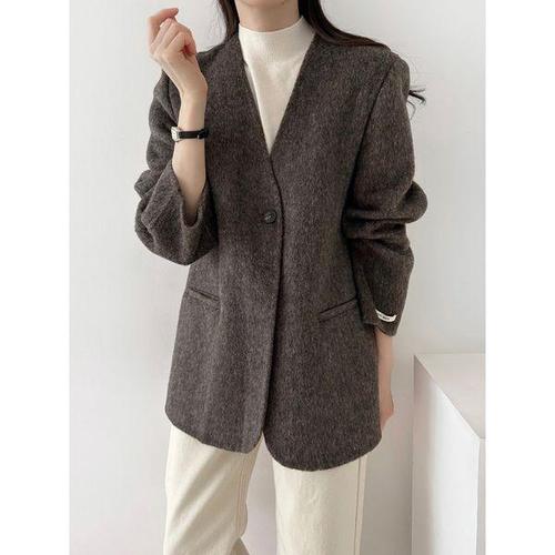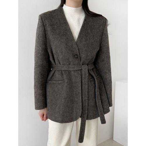 [샵앤]여성 노카라 Y단추 핸드메이드 스트랩 하프 코트 NYS-WJK-4959-브라운