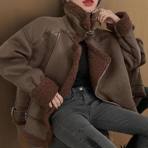 가을과 겨울 신상 여성 캐주얼 스탠딩 넥 대비 스트랩 장식 루즈 양면 재킷 코트
