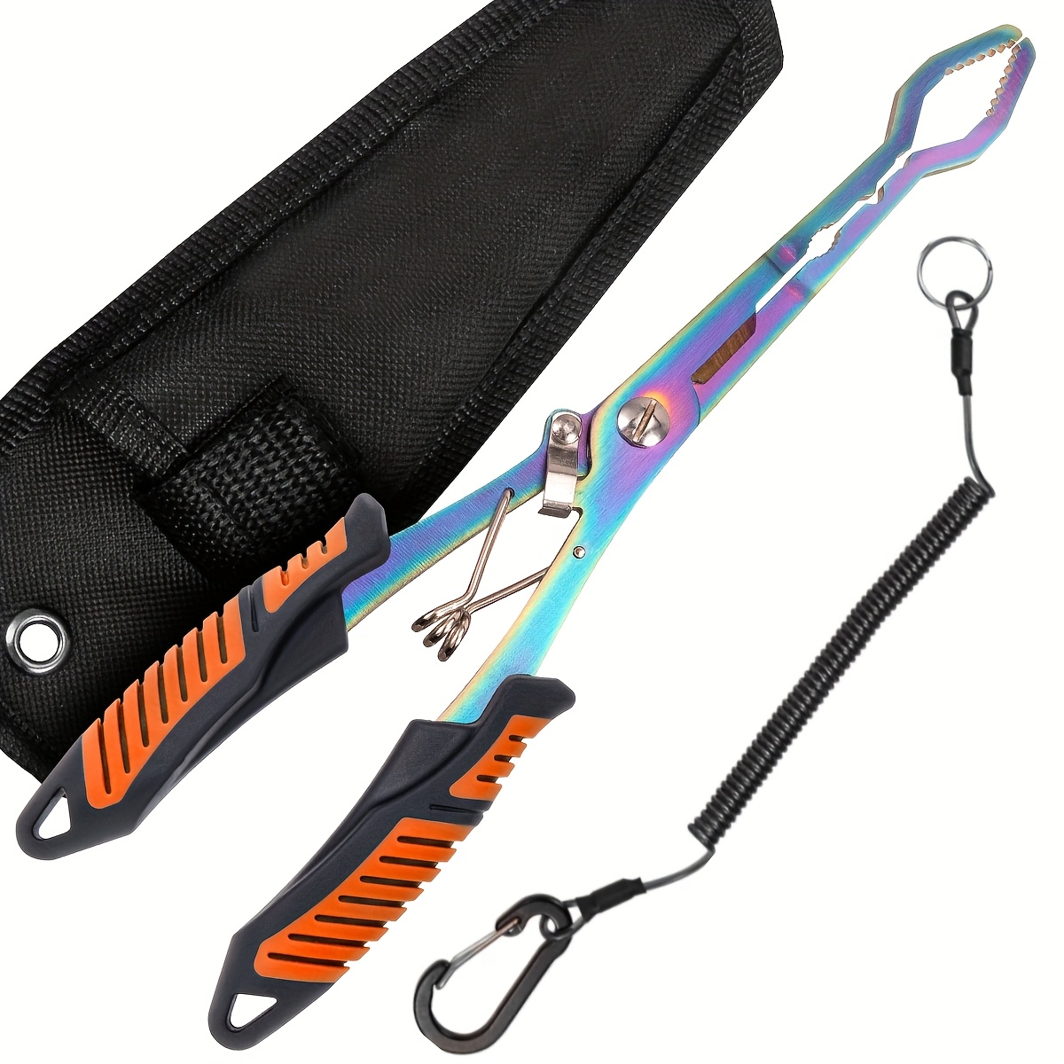 TEMU 헤비듀티 스테인리스 스틸 & 티타늄 낚시 플라이어 - 다기능 직선/곡선 턱 헤비듀티 피쉬 그리퍼, 훅 제거기, 수납 가능한 로프 & 보관 가방 포함 - 남성용 낚시 장비를 위한 두꺼운 긴 손잡이 (이상적인 선물)