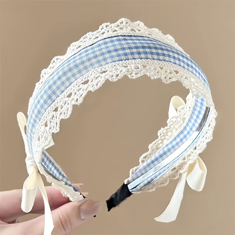 TEMU 블루 앤 화이트 체크무늬 레이스 리본 헤어밴드, 빈티지 롤리타 스타일 챙이 넓은 헤어밴드, 높은 크라운 미끄럼 방지 헤어 액세서리, 스위트 소녀스러운 헤드피스 (/체크무늬 패턴 랜덤)