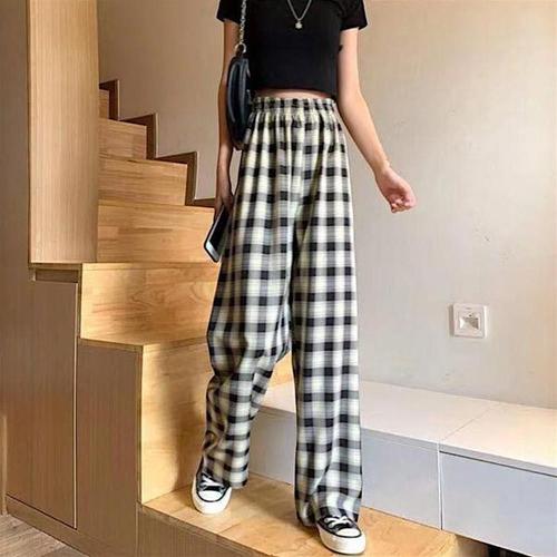 [에이치플러스몰]여성 여름 체크 아이스 밴딩 팬츠 와이드핏 쿨바지