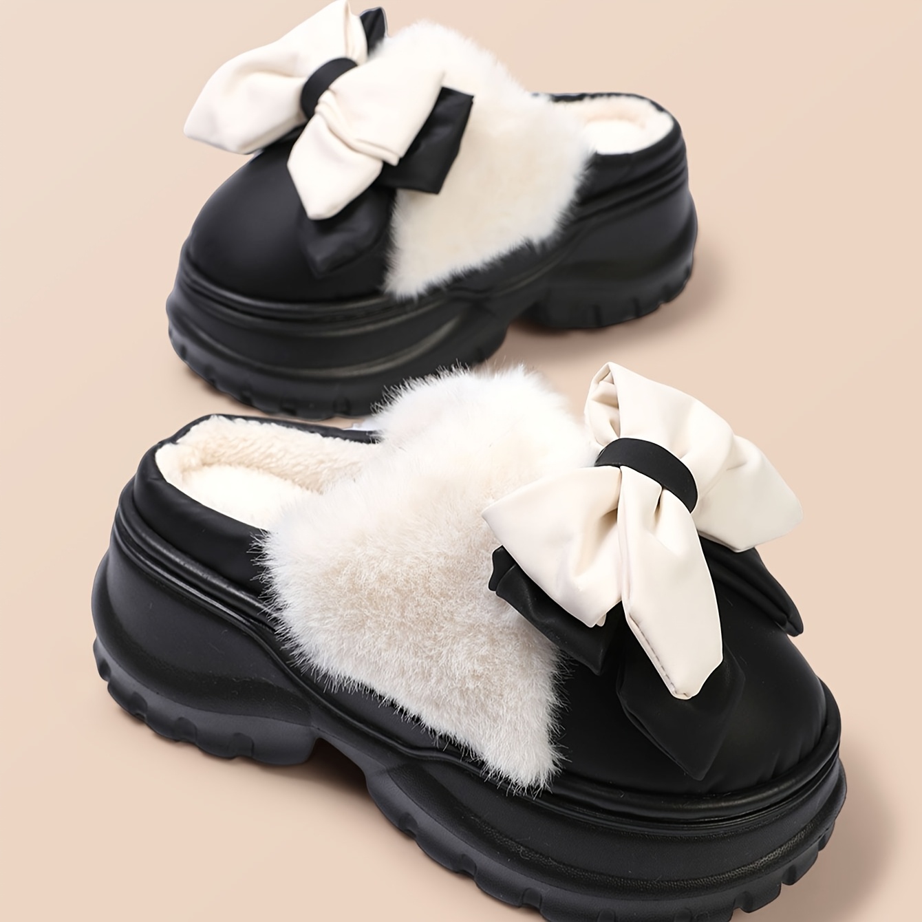 TEMU 여성용 겨울 플랫폼 슬리퍼 - 두꺼운 밑창 & 리본 장식 - 고품질 블랙/화이트 라운드 토 실내/외용 하우스슈즈, 눈, 얼음용 쿠션 - 포근하고 따뜻한 부티 (스위트 스타일)|슬리퍼|실내화|여성슬리퍼