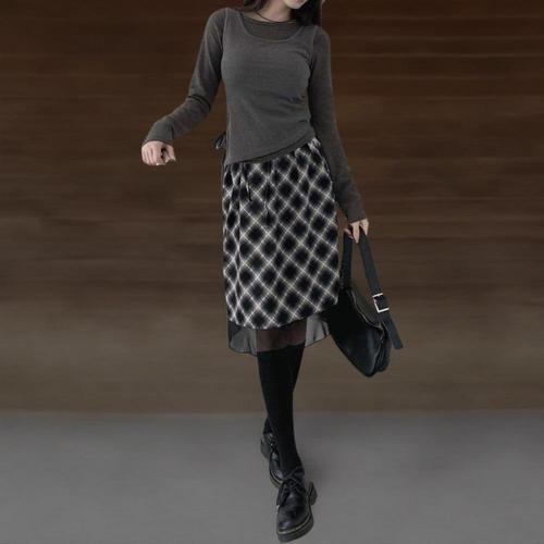 [신상오픈런]여성 심플 체크 시스루 레이어드 미디 스커트