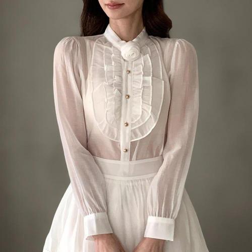 [옷자락]여성 플라워 코사주 프릴 버튼 시스루 긴팔 셔츠