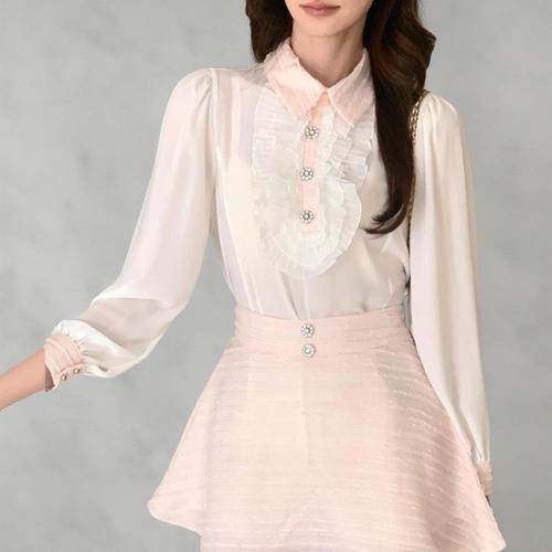 [옷자락] 여성 플리츠 프릴 큐빅 배색 카라 시스루 여리 블라우스