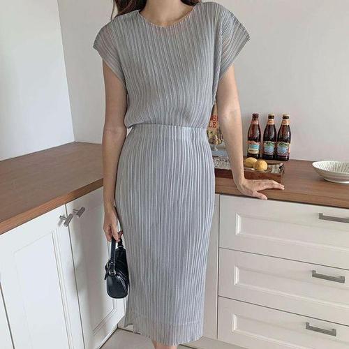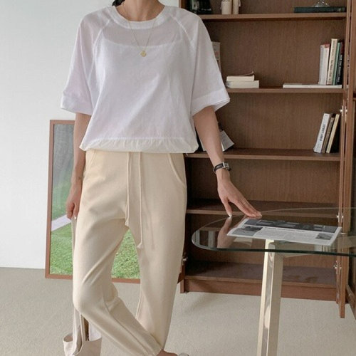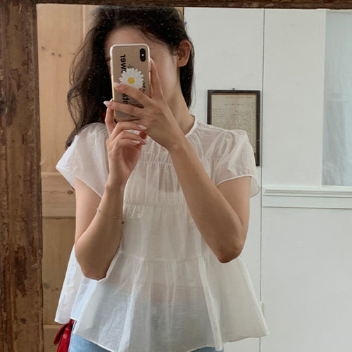 [옷자락]여성 여름 시스루 플리츠 캡숄더 반팔 티