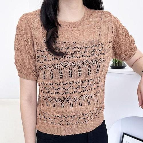 [셀러허브_여성트랜드패션]ONM 심플 여자 반팔니트 여성 시스루 라운드 니트 반