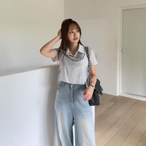 샵앤) 여성 슬릿 넓은 2단카라 시스루 루즈핏 반팔 블라우스 NYS-WBL-4635-화이트