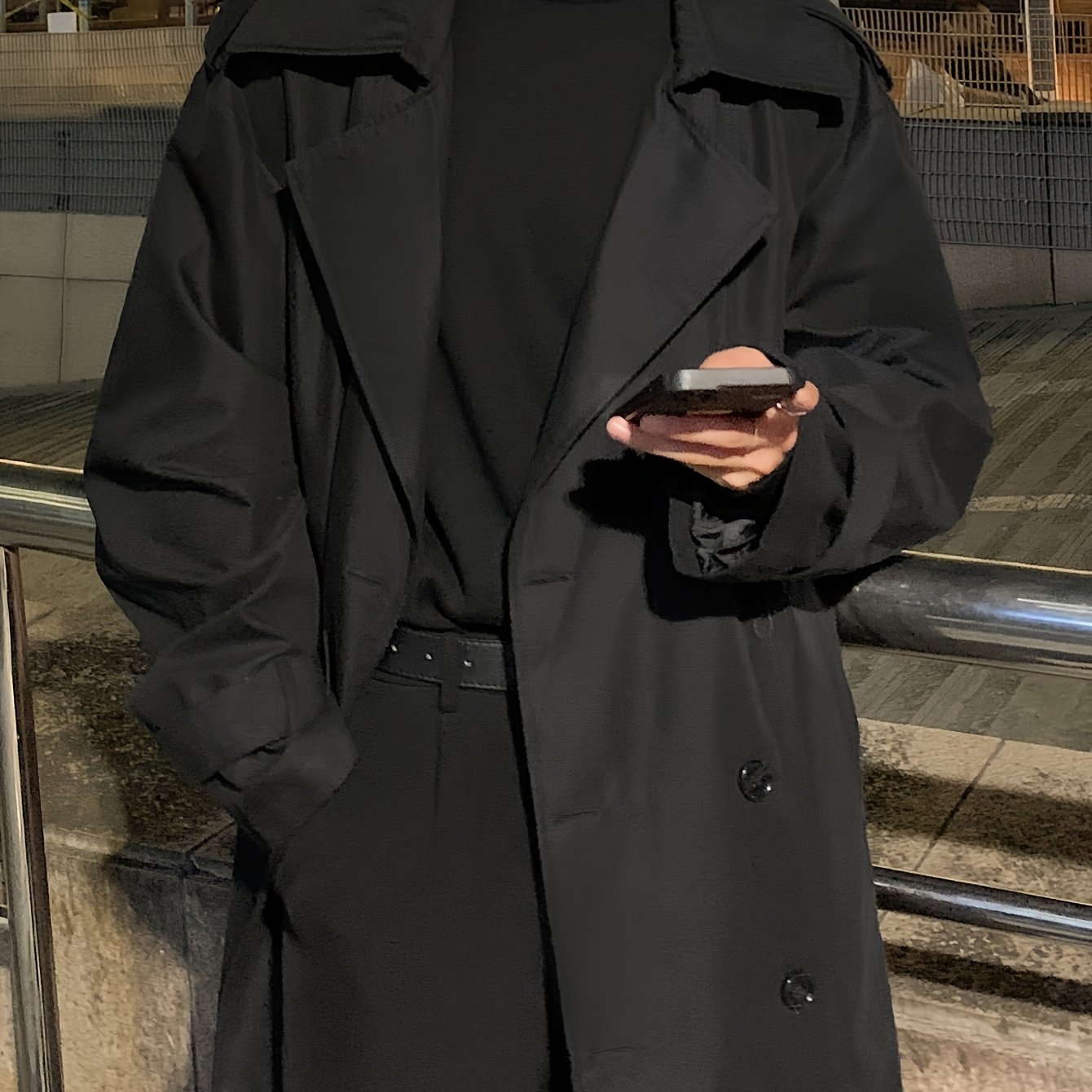 TEMU 남성용 캐주얼 폴리에스테르 트렌치 코트 - 봄/가을 롱 길이 더블 브레스트 (포켓, 라펠 칼라, 루즈핏, 단색) - 외출, 파티, 휴일 행사에 이상적